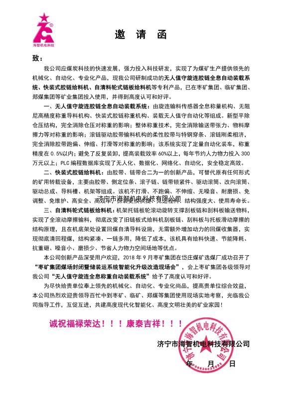 為盡快給貴單位奉上領(lǐng)先的機(jī)械化、自動化、專業(yè)化尚品,提高貴單位綜合效益,本公司熱烈歡迎貴領(lǐng)導(dǎo)百忙中到棗礦、臨礦、鄭煤等集團(tuán)使用現(xiàn)場實(shí)地考察,光臨我公司指導(dǎo)工作,互促互進(jìn),共建高度現(xiàn)代化智能化、高度文明壯美的礦業(yè)家園!